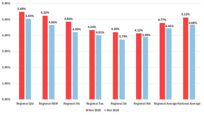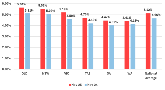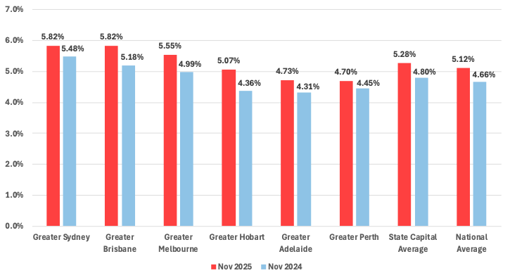 While all state capitals saw a lift in business failures over the past year, businesses in Greater Sydney and Greater Brisbane both experienced failure rates of 5.82% in the 12 months to 30 November 2025, up from 5.48% and 5.18% in November 2024, respectively. In contrast, Melbourne recorded 5.55%, Hobart 5.07%, Adelaide 4.73% and Perth 4.70% in the twelve months to 30 November 2025.
