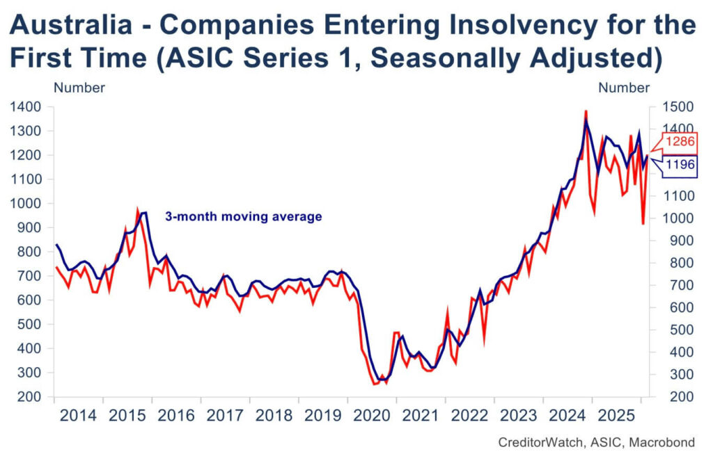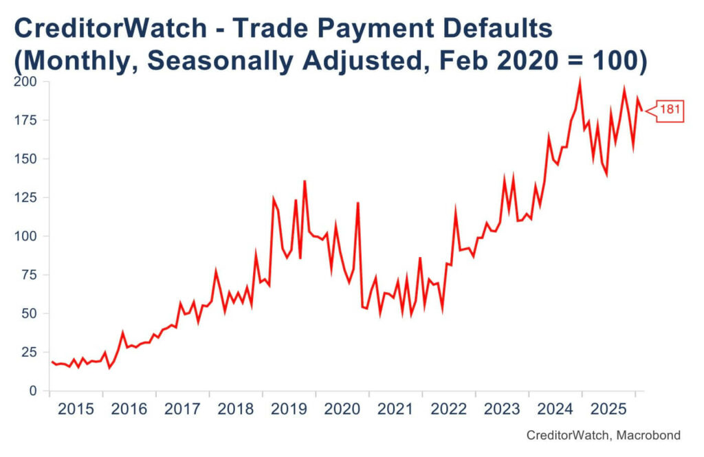 - Insolvencies are at record levels, and set to rise further – Business insolvencies and B2B payment defaults have been at or near record highs since mid 2025, with February seeing a sharp rebound in failures. With higher interest rates and an energy shock now hitting cash flow, CreditorWatch warns insolvency numbers are likely to climb again as economic growth slows.