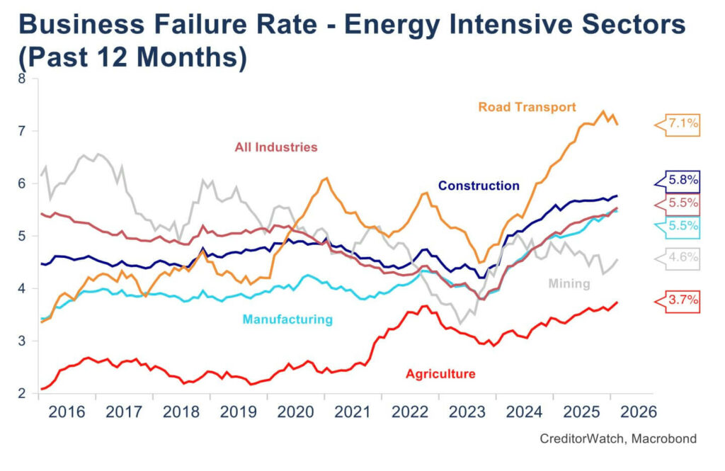 - Payment stress is flashing red before failures follow – ATO tax defaults surged late in 2025, and 60+ day payment arrears are rising across multiple sectors, including manufacturing. CreditorWatch notes these indicators typically lead insolvencies, signalling that business stress is deepening even before the full impact of the energy shock is felt.