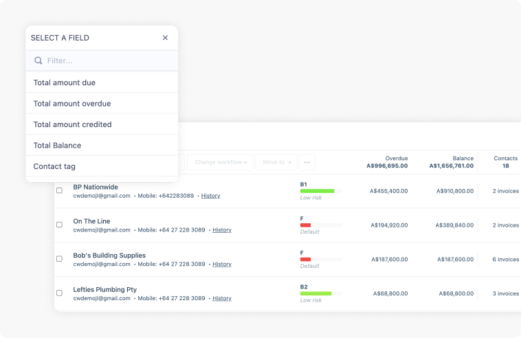 Track your debtors. Search by contact or invoice and filter by stage or age.