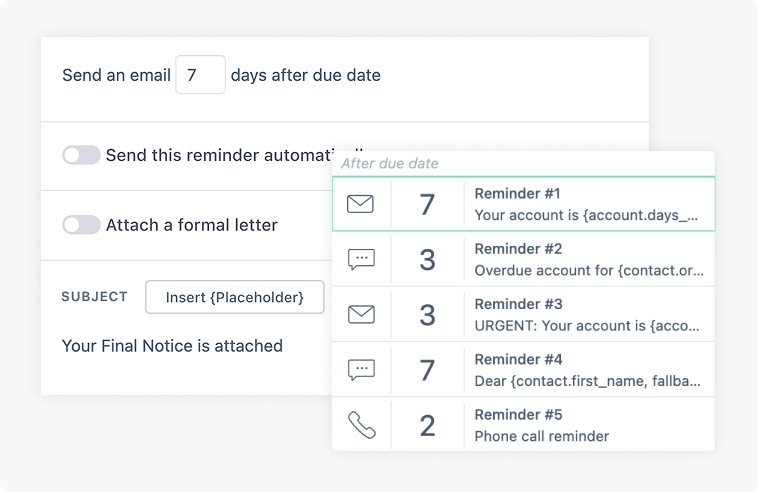 Invoice and statement reminders tailored to your brand including official reminder letters. Full log of communication captured against each account.