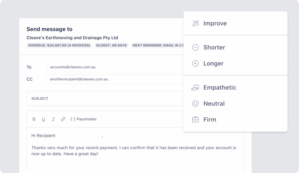 Soon, you’ll be able to send one‑off emails to debtors directly from Collect, with AI assistance to help draft and refine your message.
