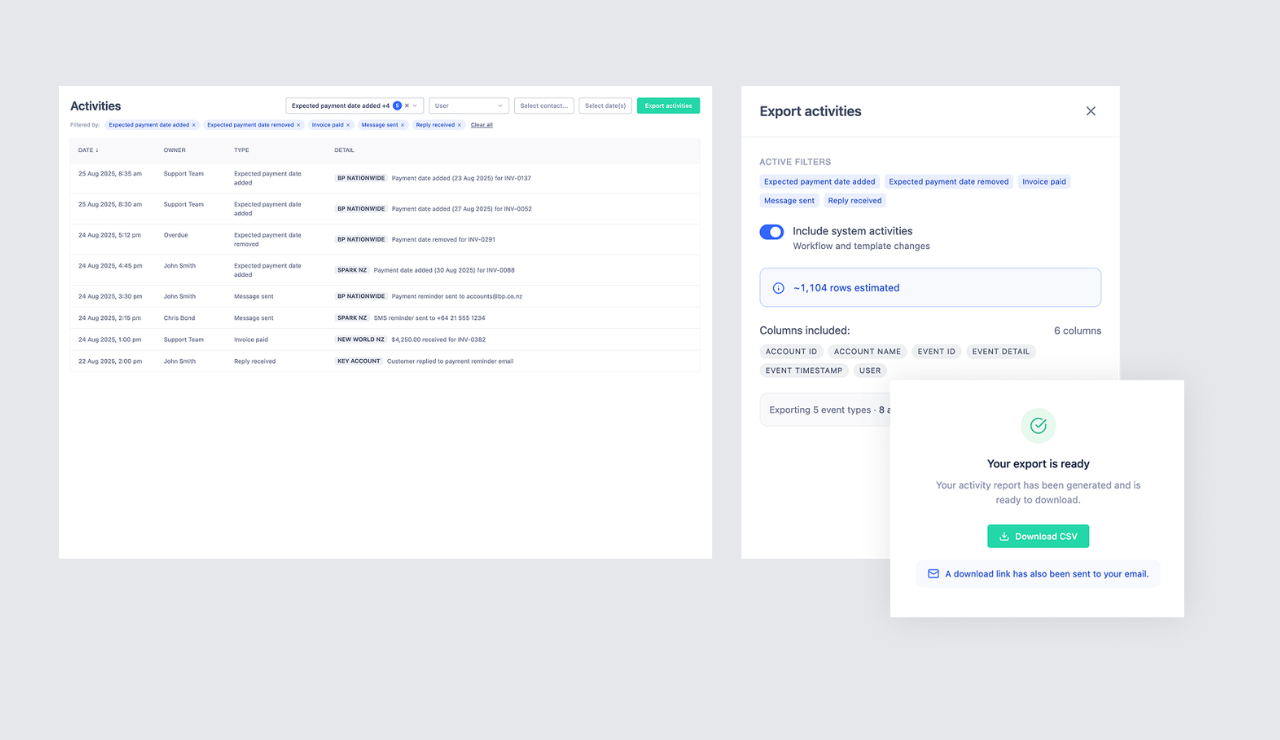 Snapshot lets you export a complete, point‑in‑time view of receivables activity including notes, invoice status, and payment history in a clear, auditable format.