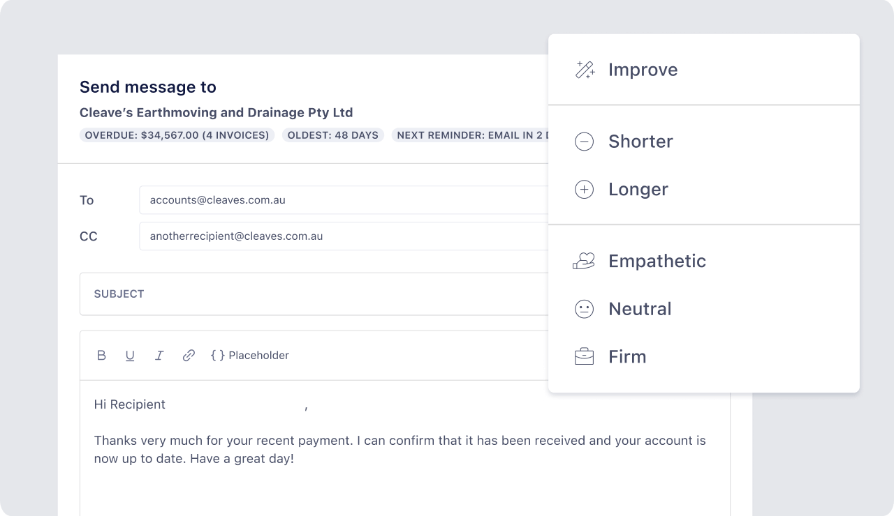Now when your customer pays their oldest overdue invoice, smart workflows automatically adjust the workflow to reflect the true overdue age of the account, so reminder language and tone is always appropriate for that customer’s new status.