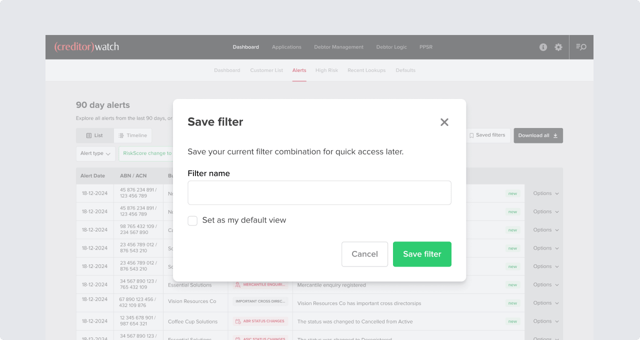 Save up to five named filter views on the risk Alerts table, combining alert type, RiskScore change, and payment rating change filters. Quickly switch between views without reapplying filters, and zero in on high-priority changes you need to monitor regularly.
