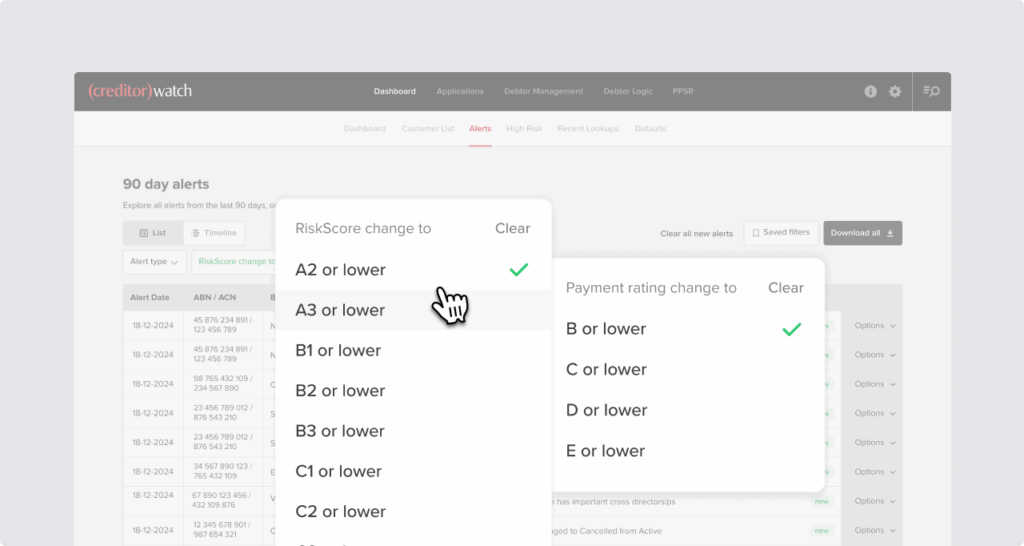 Two new filters allow you to view risk alerts by a change to an entity’s RiskScore or payment rating, so you can quickly identify and focus on companies whose risk profile or payment behaviour has worsened.