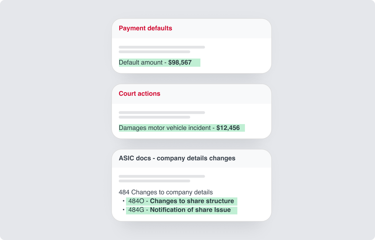 Now, both places will display payment default amounts, court action details including the nature of the claim and claim amount, and ASIC document 484 company change details.