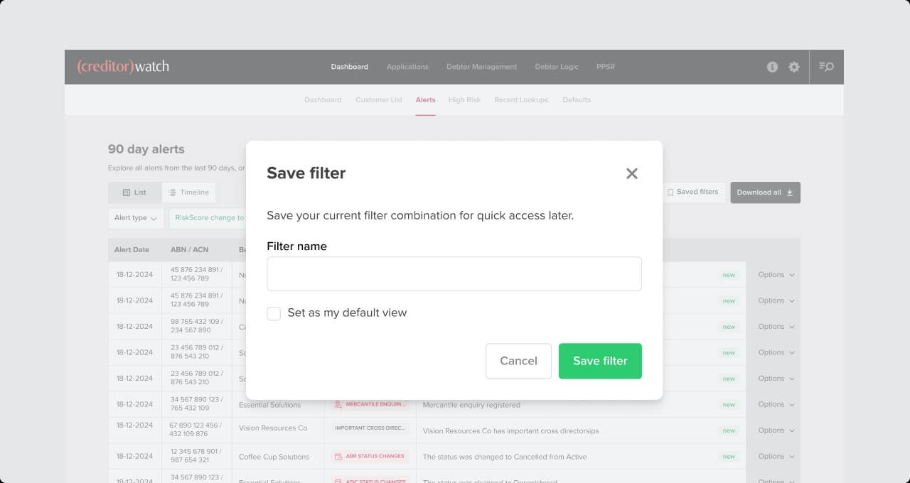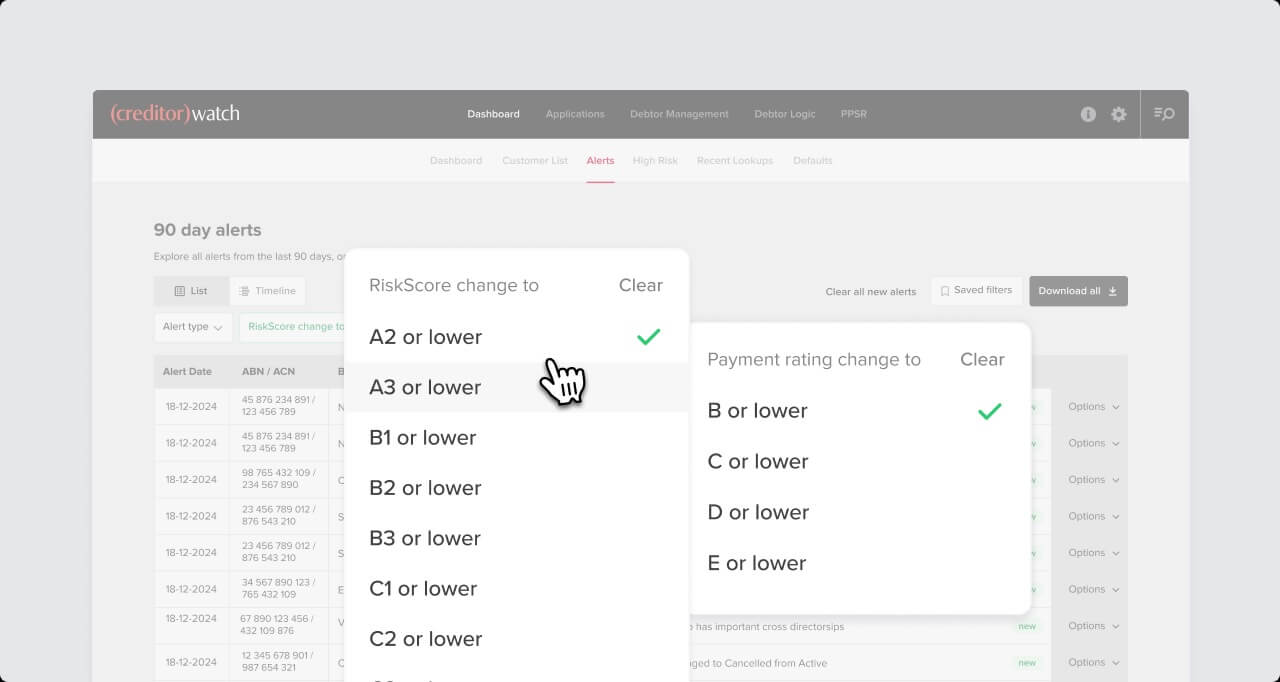 The Alerts tab in CreditorWatch is adding new filters to show businesses whose RiskScore or payment rating has fallen beneath a specific threshold. This lets you track when a business’s overall risk or payment rating worsens – similar to the notifications you currently receive in the Alerts emails.