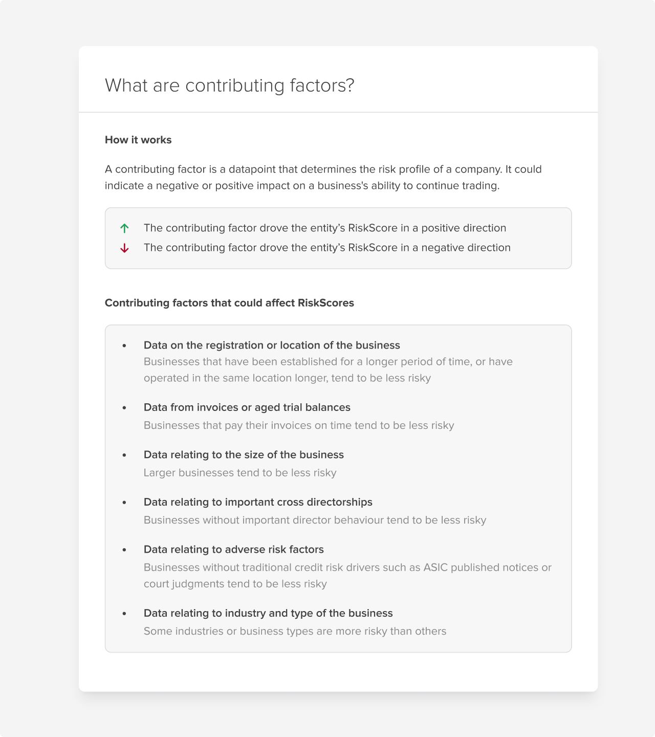 We’ve added more transparency to RiskScores. Users can now see the key contributing factors that are driving a business’s risk score and risk rating — right in the RiskScore section.